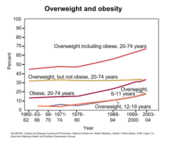 تضاعفت معدلات البدانة في الولايات المتحدة ثلاث مرات تقريبًا منذ الستينيات القرن العشرين. عام 1962، كان نحو 13٪ من البالغين الأمريكيين بدينين،[35] وبحلول عام 2002، وصلت معدلات البدانة إلى 33٪ من السكان البالغين.[36] وفقًا لدراسة أجراها برنامج الصحة الوطنية وفحص التغذية جُمِعت بياناتها ما بين سبعينيات القرن العشرين وعام 2004، زاد انتشار زيادة الوزن والبدانة بشكل ثابت لدى جميع مجموعات الأمريكيين.[37][38] تستمر الأرقام في الارتفاع، اعتبارًا من عام 2007، كان 33٪ من الرجال و36٪ من النساء بدينين،[39] وبحلول عامي 2015 - 2016، كان لدى 39.6٪ من إجمالي السكان البالغين (37.9٪ من الرجال و41.1٪ من النساء) بدانة.[40][41] تختلف معدلات البدانة بين المجموعات الاجتماعية المتنوعة، حيث تزداد احتمالية حدوث البدانة لدى بعض المجموعات العرقية والأفراد ذوي الدخل المنخفض، بينما تظهر الأقليات الأخرى معدلات بدانة أقل. اعتبارًا من عام 2014، كانت المعدلات منخفضة تصل إلى 12٪ لدى النساء الآسيويات غير الهسبانيات (non-Hispanic) ومرتفعة تصل إلى 57٪ لدى النساء الأمريكيات من أصل أفريقي.[42][43]