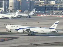 طائرة من طراز بوينغ 777 تابعة لخطوط إل عال الجوية تهبط في مطار بن غوريون الدولي. يمكن مشاهدة طائرتين من اسطول إل عال في الخلفية.