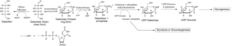 الغالاكتوز يتم تحويله إلى جلوكوز من خلال عمل ثلاثة إنزيمات يعرفوا بمسار ليلوار( Leloir pathway)، هناك أمراض متعلقة بخلل كل من هذه الانزيمات