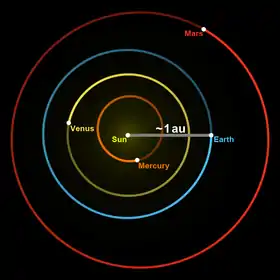 تمثل الوحدة الفلكية (رمزها و.ف.) متوسط المسافة بين الأرض والشمس.