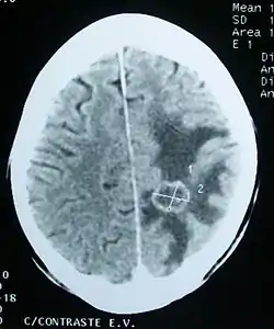 ![]() استسقاء (المناطق الأغمق لونا) المحيطة بورم دماغي ثانوي. استسقاء (المناطق الأغمق لونا) المحيطة بورم دماغي ثانوي. | |