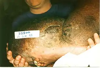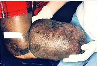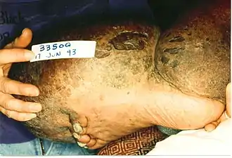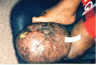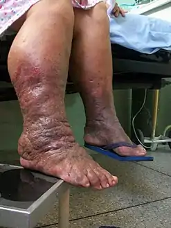 وَالصُور التالية لحالة مصابة بالوذمة اللمفية الوراثية، وَالتي استمرت بِلا علاج لمدة 25 عاماً.