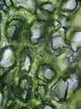 - النسيج الإسفنجي: خلايا هذا النسيج خلايا مفككة غير منتظمة ويوجد بينها مساحات معينة لهذا سمي نسيج اسفنجي تحتوي خلاياه على نسبة قليلة من بلاستيدات خضراء، وظيفته تكوين جهاز تهوئة يساعد بعملية التركيب الضوئي.