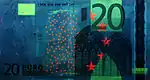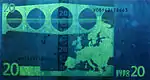 - الحبر فوق البنفسجي،[28] تحت الضوء فوق البنفسجي تظهر الألياف المدمجة في الورق ملونة باللون الأحمر والأزرق والأخضر، ويظهرُ علم الاتِّحاد الأوروبيّ باللون الأخضر وله نجومٍ برتقالية، ويتحول توقيع رئيس البنك المركزي الأوروبيّ إلى اللون الأخضر، والنجوم الكبيرة والدوائر الصغيرة على التوهج الأمامي والخريطة الأوروبية، يظهر الجسر ورقم القيمة في الخلف باللون الأصفر.[31]