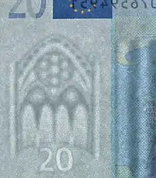 - ثقوب،[28] امسك الورقة النقدية مقابل الضوء. يجب أن ترى ثقوبًا في الصورة ثلاثية الأبعاد والتي ستشكل الرمز €. يجب أن تشاهد أيضًا أرقامًا صغيرة توضح القيمة.
