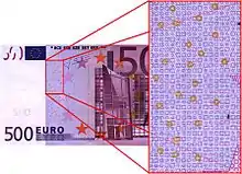 - الطباعة المصغرة،[22] في العديد من مناطق الأوراق النقدية، يمكنك رؤية الطباعة المصغرة، على سبيل المثال، داخل "ΕΥΡΩ" (EURO بالأحرف اليونانية) في المقدمة. وتحتاج إلى عدسة مكبرة لرؤيتها، وهو نصَّ صغير حاد وغير واضح.
