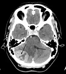 ![]() انبثاث الورم الدماغي في نصف الكرة الدماغية الأيمن بسبب سرطان الرئة يظهر بالتصوير بالرنين المغناطيسي الموزون بT1 مع التباين داخل الوريد. انبثاث الورم الدماغي في نصف الكرة الدماغية الأيمن بسبب سرطان الرئة يظهر بالتصوير بالرنين المغناطيسي الموزون بT1 مع التباين داخل الوريد. | |