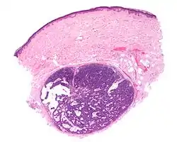 ![]() صورة مجهرية لورم الغدة العرقية بصبعة H&E صورة مجهرية لورم الغدة العرقية بصبعة H&E | |