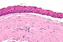 التشخيص النهائي عن طريق التحليل النسيجي ، أي الاستئصال وفحصها تحت المجهر . تشبه الأغشية الحرشفية الكيراتينية بغموض .[2]