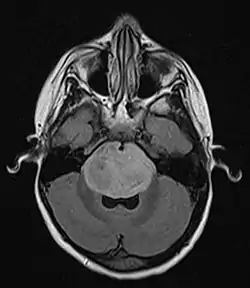 ![]() ورم دبقي في جذع الدماغ. صورة رنين مغناطيسي محورية مع مادة تباين ورم دبقي في جذع الدماغ. صورة رنين مغناطيسي محورية مع مادة تباين | |