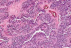 ![]() صورة مجهرية لورم حليمي كاذب صلب بصبغة الهيماتوكسيلين واليوزين. صورة مجهرية لورم حليمي كاذب صلب بصبغة الهيماتوكسيلين واليوزين. | |