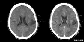![]() ورم دبقي في الفص الجداري الأيسر. صورة بالأشعة المقطعية للدماغ. | |