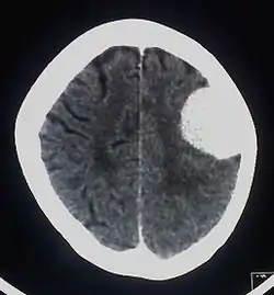 ![]() صورة أشعة مقطعية متباينة للدماغ توضح شكل الورم السحائي صورة أشعة مقطعية متباينة للدماغ توضح شكل الورم السحائي | |