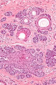 ![]() صورة مجهرية للورم الظهاري الشعري. صبغة الهيماتوكسيلين والأيوسين. صورة مجهرية للورم الظهاري الشعري. صبغة الهيماتوكسيلين والأيوسين. | |