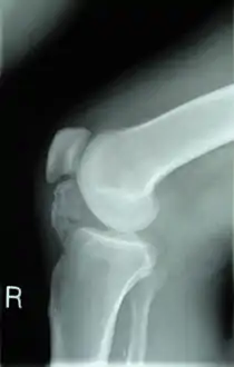 ![]() Lateral radiograph of the knee demonstrating ossification in the peritendinous tissues in a patient with osteochondroma. Lateral radiograph of the knee demonstrating ossification in the peritendinous tissues in a patient with osteochondroma. | |