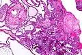 صورة مجهرية توضح السمات المميزة للأورام البلعومية القحفية المينائية - المساحات الكيسية والتكلسات والكيراتين "الرطب". بصبغة HPS.