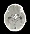 فحص بالأشعة المقطعية يظهر ورمًا بلعوميًا قحفيًا.