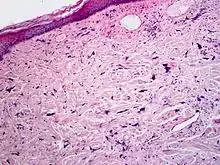 صورة مجهرية للورم الليفي مُتعدد الأشكال. الخلية مُنضبة مع نسيج ضام ليفي وخلايا ليفية يافعة غير نمطية