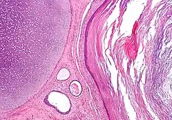 ![]() صورة مجهرية لورم مسخي يظهر نسيجا يحتوي على طبقات التبرعم الثلاث: الأديم المتوسط (غضروف غير ناضج - الزاوية العليا اليسرى من الصورة)، الأديم الباطن (غدد هضمية - أسفل وسط الصورة) والأديم الظاهر (البشرة - يمين الصورة). صورة مجهرية لورم مسخي يظهر نسيجا يحتوي على طبقات التبرعم الثلاث: الأديم المتوسط (غضروف غير ناضج - الزاوية العليا اليسرى من الصورة)، الأديم الباطن (غدد هضمية - أسفل وسط الصورة) والأديم الظاهر (البشرة - يمين الصورة). | |