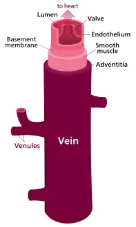 ![]() هيكل الوريد، والذي يتكون من ثلاث طبقات رئيسية. الطبقة الخارجية نسيج ضام، يسمى الغلالة البرانية أو غلالة خارجية; وطبقة وسطى من العضلات الملساء تسمى غلالة وسطانية، والطبقة الداخلية مبطنة ببطانة غشائية تسمى غلالة باطنة. هيكل الوريد، والذي يتكون من ثلاث طبقات رئيسية. الطبقة الخارجية نسيج ضام، يسمى الغلالة البرانية أو غلالة خارجية; وطبقة وسطى من العضلات الملساء تسمى غلالة وسطانية، والطبقة الداخلية مبطنة ببطانة غشائية تسمى غلالة باطنة. | |