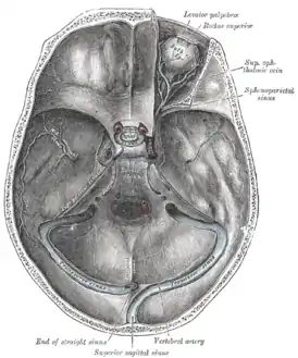 ![]() The sinuses at the base of the skull. (Superior ophthalmic vein labeled at upper right.) The sinuses at the base of the skull. (Superior ophthalmic vein labeled at upper right.) | |