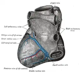 ![]() السطح السفلي للقلب (ويظهر الوريد القلبي الكبير أوسط اليسار). | |