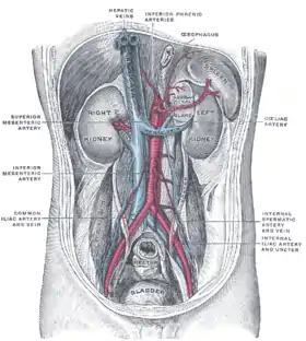 ![]() الجدار البطني الخلفي (بعد إزالة الصفاق)، وتظهر الكلى، والمحافظ الكظرية، والأوعية الدموية الكبيرة. (الأوردة الكبدية معنونة في أعلى المنتصف) | |