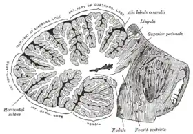 مقطع سهمي في المخيخ, بالقرب من اتصال دودة المخيخ مع نصفاه الكرويان.
