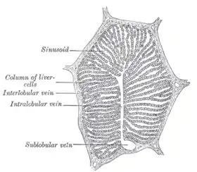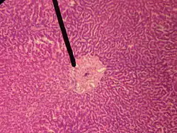 ![]() فصيص وحيد للكبد مكبر 60 ضعف. (الوريد المركزي غير معنون، خلال المنطقة المرئية. الوريد المركزي يظهر كوريد وحيد في مركز الفصيص. راجع قسم روابط خارجية لعروض تقديمية أوضح.) | |