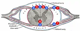 ![]() 1: الوريد الشوكي الخلفي 2:الوريد الشوكي الأمامي 3:الوريد الشوكي الخلفي الوحشي 4:الوريد الجذري (أو النخاعي القطعي) 5:الشرايين الشوكية الخلفية 6:الشريان الشوكي الأمامي 7:الشريان الجذري (أو النخاعي القطعي) | |