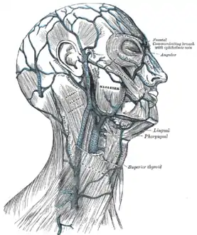 ![]() أوردة الرأس والرقبة (الأمامي الوداجي يظهر في الأسفل إلى اليمين) أوردة الرأس والرقبة (الأمامي الوداجي يظهر في الأسفل إلى اليمين) | |