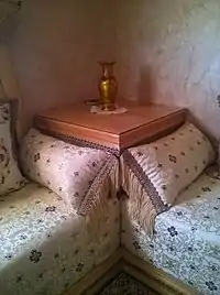 وسائد على زاوية أريكة، في صالة مغاربية.
