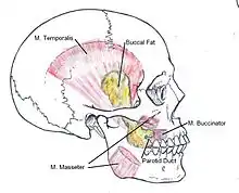 |CitationClass=تم تجاهله (مساعدة) - Hwang; Cho, HJ; Battuvshin, D; Chung, IH; Hwang, SH (2005). "Interrelated buccal fat pad with facial buccal branches and parotid duct". The Journal of craniofacial surgery. 16 (4): 658–60. doi:10.1097/01.SCS.0000157019.35407.55. PMID 16077311. الوسيط