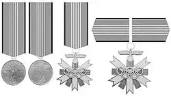 من الفئات الثلاثة، تم تقديم الدرجة الأولى على شكل رقبة. لم تقتصر الميدالية على المواطنين الألمان. يمكن ارتداء جميع الفصول الدراسية على شكل شريط صغير. [6] يحظر القانون الألماني الحديث ارتداء الصليب المعقوف، لذلك في عام 1957 أذنت الحكومة الفيدرالية الألمانية بأوسمة الزينة بدلاً من نسخة الصليب المعقوف؛ التي لا تزال موجودة ويمكن ارتداؤها كزينة مدنية. [7]