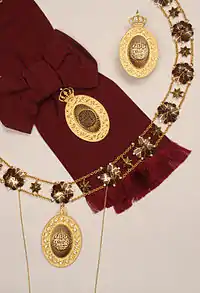 - الشارة بيضاوية الشكل، مصنوعة من الذهب والألماس، في مركزها قرص أحمر مكتوب عليه جملة باللغة العربية. الشارة معلقة بالوشاح بواسطة التاج الملكي الذهبي.