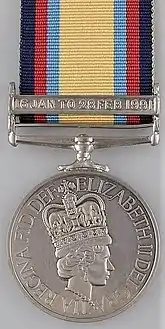 منح الوسام للأفراد الذين قضوا ثلاثين يوم خدمة مستمرة في الشرق الأوسط (في منطقة محددة من العمليات بما في ذلك قبرص) ما بين 2 أغسطس 1990 و7 مارس 1991. منح الوسام لأولئك الذين خدموا في الكويت أثناء الغزو العراقي وبالنسبة لأولئك الذين شاركوا في عمليات تحرير الكويت.[1]