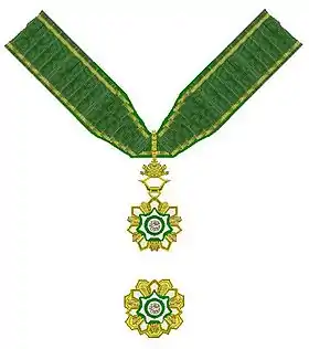 - الدرجة الأولى: تلبس الشارة على الرقبة، بالإضافة إلى نجمة فضية على صدره الأيسر.