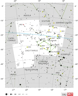 | Kaus Media, Kaus Meridionalis, Media, δ Sagittarii, δ Sgr, Delta Sgr, 19 Sagittarii, CCDM J18210-2950A, CPD-30 5513, فهرس النجوم الأساسية 687, GC 25024, HD 168454, هيباركوس 89931, فهرس النجم الساطع 6859, IDS 18146-2952 A, PPM 268275, فهرس مرصد سميثسونيان للفيزياء الفلكية 186681, WDS J18210-2950A.[6] | |