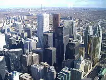 تضم المنطقة أكبر تجمع لناطحات السحاب ومراكز الأعمال، وتُشكل هذه المباني خط الأفق للمدينة. يأتي وسط تورونتو في المركز الثالث من حيث ناطحات السحاب التي يتخطى طولها 200 متر (656 قدم) في أمريكا الشمالية بعد نيويورك وشيكاجو.[1]