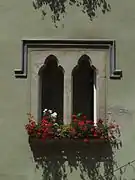 نافذة ثُنائِيُّة مُزَيَّنَةٌ بالزُهُور تشِي بجَمَال فُنُونٌ العِمَارَة في القُرونٌ الوُسْطى.