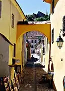 مَصابيحُ وتَذْكَارِات سِيغيسوارا في أحد الممرّات المُؤَدٍّية إِلَى سَاحة البَلدة التَّاريخيَّة.