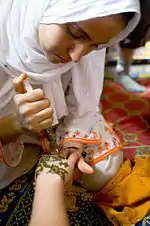 قال: "لعن الله الواصلة والمستوصلة، والواشمة والمستوشمة". لكن هنالك اختلاف في أراء علماء السنة فيما يتعلق في سبب تحريم الوشم.[35] ولذلك فإن استخدام الحنة كوشم مؤقت شائع جداً في الدول الإسلامية.
