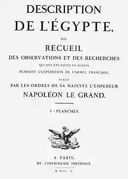 وصف مصر Description de l'Égypte (بالفرنسية) ![]() عنوان الكتاب ، الطبعة الأولى 1809