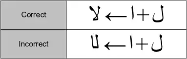 رمز "لا" (يونيكود : 0xFEFB)، حيث يوضح السطر الأول من الشكل يوضح الصياغة الصحيحة لرمز "لا" بينما السطر الثاني يوضح الصياغة الخاطئة دون استخدام الوصلات الابجدية.
