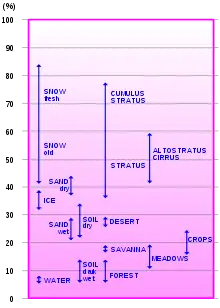 على الرغم من أن الوضاءة والحرارة لها تأثير على المناطق الأبرد في الأرض. بسبب تساقط الثلوج إلا أنها ذات قيمة أعلى في المناطق المدارية بسبب كمية الإشعاع شمسي