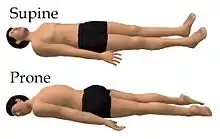 وباستخدام المصطلحات التشريحية للموقع، فإن الجانب الظهري يكون للأسفل، والجانب البطني للأعلى عند الاستلقاء.
