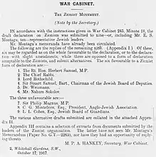- 25 أكتوبر 1917: "... ذكر السكرتير أنه كان هناك ضغوط من وزارة الخارجيّة لتقديم مسألة الصهيونيّة، وكان يُنظر إلى التسوية الباكرة بأهميّة كبيرة."[133]