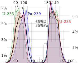 الانشطار النووي لذرة اليورانيوم -235 يكون مصحوبا بإصدار طاقة قدرها 202.5 مليون إلكترون فولت (= 3.24 × 10−11 J) والتي تساوي 19.54 مول.