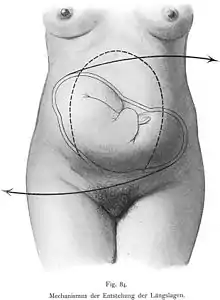 البشر هم من ثنائيات الأرجل في حالة منتصبة، هذه الحالة المنتصبة تساعد في وضع ثقل البطن على قاع الحوض، هو تركيب معقد لا تدعم فقط الوزن ولكن تسمح لثلاث قنوات بالمرور خلالها: مجرى البول، المهبل والمستقيم. رأس الرضيع وكتفاه يجب أن يمروا خلال تسلسل معين من المناورات ليمر خلال حلقة لحوض الأم. ست مراحل من ولادة قمة الرأس "الظهور الأول للرأس": 1- إشراك رأس الجنين عن طريق الوضع العرضي. بحيث يواجه رأس الطفل الحوض للأم بوركها الأول أو الآخر. 2- نزول وانثناء رأس الجنين. 3- الدوران الداخلي. يدور رأس الجنين بمقدار 90 درجة بوضعية الخلفي-الأمامي بحيث يكون وجه الطفل باتجاه المستقيم للأم. 4- الولادة عبر التوسع. يمر رأس الجنين من قناة الولادة. تتم إمالة رأسه للأمام بحيث تساعد مقدمة رأسه لتمهيد الطريق خلال المهبل. 5- تصحيح الوضعية. يدور رأس الجنين 45 درجة لاستعادة الوضع الطبيعي مع الأكتاف، التي لا تزال مع زاوية. 6- الدوران الخارجي. تعيد الأكتاف الحركة الدورانية للرأس، التي يمكن ملاحظتها من خلال الحركات النهائية لرأس الجنين. الموقف يشير إلى علاقة الجنين الذي يظهر مستوى الأشواك الإسكية، عندما يكون الجزء الظاهر في الأشواك الإسكية يكون الموقف هو صفر(مرادف للاشتراكية). إذا كان الجزء الجنيني الظاهر فوق الأشواك، المسافة تقاس وتوصف بالسالب، التي تتراوح ما بين -1 و -4سم. إذا كان الجزء الظاهر فوق الأشواك، المسافة تقاس بالموجب(+1-إلى +4سم). إذا كانت +3 و +4 فإن الجزء الظاهر يكون في العجان ويمكن رؤيته.[13]