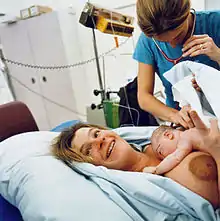 "المرحلة الرابعة من المخاض" تبدأ مباشرة بعد ولادة الطفل، وتمتد لمدة 6 أسابيع. و غالباً ما يستخدم مصطلح "بعد الولادة" لوصف هذه الفترة.[40] هو الوقت الذي يعود فيه جسم الأم، متضمناً لمستوى الهرمونات وحجم الرحم، يعود إلى وضعة الطبيعي ومقدرة المولود الجديد للتكيف على العيش خارج جسم الأم. تصف منظمة الصحة العالمية فترة ما بعد الولادة بأنها أهم مرحلة ولكن الأكثر إهمالاً في حياة الأمهات و الأطفال. معظم حالات الوفاة تحدث خلال فترة ما بعد الولادة.[41] بعد الولادة إذا عانت الأم من تفسخ أو تمزق العجان، يتم خياطته. يجب أن تخضع الأم لتقييمات منتظمة حول انقباضات الرحم ومستوى التقعر،[42] و النزيف المهبلي، معدل ضربات القلب وضغط الدم، والحرارة، بعد أول 24 ساعة من الولادة. يتم توثيق خروج البول خلال 6 ساعات.[41] ألم بعد الولادة (يشبه ألم انقباضات الحيض)، تقلصات الرحم لمنع تدفق الدم المفرط، تستمر لعدة أيام. الإفرازات المهبلية، يطلق عليها "هلابة" يتوقع أن تستمر لعدة أسابيع؛ قي البداية تكون أحمر فاتح، تصبح تدريجياً وردية، تتحول إلى البني، وبالنهاية إلى الأصفر أو الأبيض.[43] حتى وقت قريب الأطفال اللذين يولدون في المستشفيات ويتم إبعادهم عن أمهاتهم لفترة قصيرة بعد الولادة إلا عندما يحين موعد الطعام. يتم إخبار الأم بأن وضع الطفل في الحاضنة يكون أكثر أماناً وهذا الفصل يمنح الأم مزيداً من الوقت للراحة. بدأ السلوك يختلف، بعض المستشفيات يقدمون عرض "المصاحبة" بعد فترة من الإجراءات الروتينية للمستشفى والمراقبة، الرضيع يمكن أن يشارك الأم بنفس الغرفة. مع ذلك، مزيد من المعلومات الأخيرة بدأت في التشكيك بالممارسة القياسية لإزالة الأطفال بعد الولادة مباشرة لإجراءات ما بعد الولادة الروتينية قبل إعادته إلى الأم. منذ حوالي 2000 عام، بدأت بعض السلطات تشير إلى أن الاتصال من الجلد إلى الجلد (وضع الطفل عارياً على صدر الأم) يمكن أن يفيد الأم والرضيع. من خلال الدراسات على الحيوانات أشارت أن الاتصال الحميم من الجلد إلى الجلد يحفز السلوك العصبي، التي تؤدي إلى تلبية الحاجات البيولوجية الأساسية كنموذج، وقد تم القيام بالدراسات الحديثة للتقييم، إذا كان هناك أي فائدة للاتصال المباشر من الجلد إلى الجلد بين الأمهات وأطفالهم. النشرة الطبية 2011 تشير إلى دراسة مثيرة ووجدت أن الاتصال المبكر من الجلد إلى الجلد، في بعض الأحيان تسمى رعاية الكنغر، أدت إلى تحسن نتائج الرضاعة الطبيعية، واستقرار القلب والجهاز التنفسي، والتقليل من بكاء الطفل.[44][45][46] دراسات نشرات كوكرين وجدت أن الاتصال من الجلد إلى الجلد عند الولادة يقلل من بكاء الطفل، تحافظ على دفء الطفل ويحسن من التفاعل بين الأم والطفل، وتحسين فرص الرضاعة الطبيعية الناجحة.[47] اعتباراً من 2012، الاتصال من الجلد إلى الجلد في الولادة المبكرة أيدت من قبل جميع المنظمات الرئيسية المسؤولة عن صحة الرضيع، تتضمن الأكاديمية الأمريكية لطب الأطفال.[48] تنص منظمة الصحة العالمية "عملية رلادة الطفل لا تنتهي حتى يتم نقله الآمن من المشيمة إلى تغذية الثدي." ينصح بوضع الطفل من الجلد إلى الجلد مع الأم، وتأجيل أي إجراءات روتينية على الأقل 1-2 ساعة. و تقترح منظمة الصحة العالمية أن أي ملاحظات أولية للرضيع يمكن القيام بها على مقربة من الأم، وأن الفصل حتى لو كان لفترة قصيرة قبل الحصول على التغذية الأولى يمكن أن تعكر صفو العلاقة بين الأم والطفل. و ينصح الباحثون بالاتصال الدائم من الجلد إلى الجلد باستمرار خلال الأيام الأولى بعد الولادة، خاصة إذا انقطع الاتصال لفترة وجيزة بعد الولادة.[49] المعهد الوطني للرعاية والصحة المتميزة ينصح بتأجيل بعض الإجراءات مثل الوزن، القياسات، والاستحمام لمدة ساعة لضمان الفترة الأولية لاتصال الجلد مع الجلد بين الأم والرضيع.[50]
